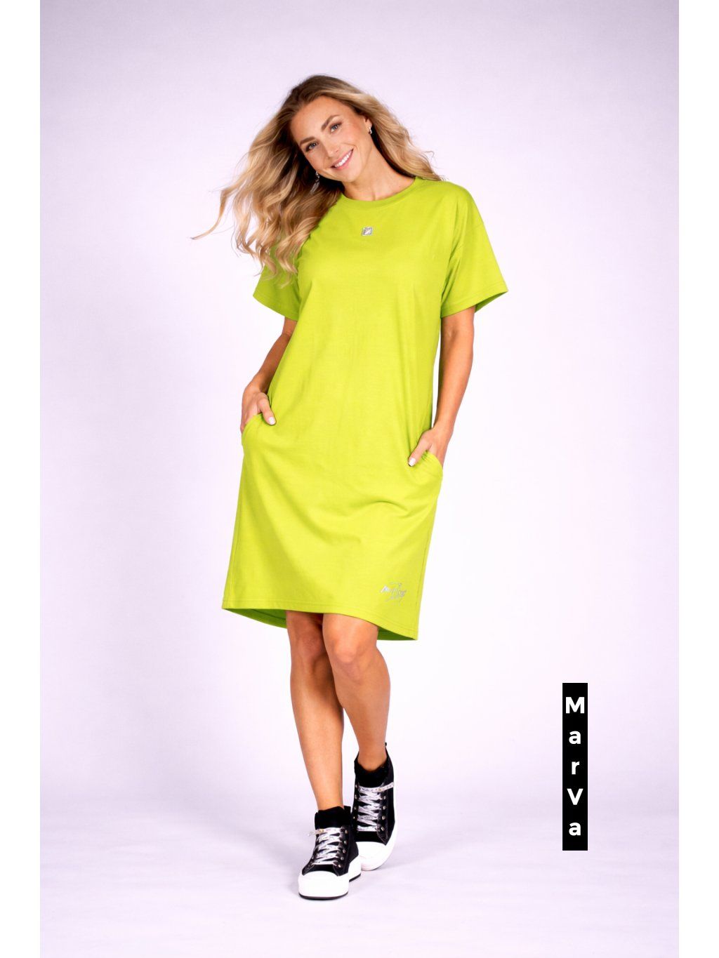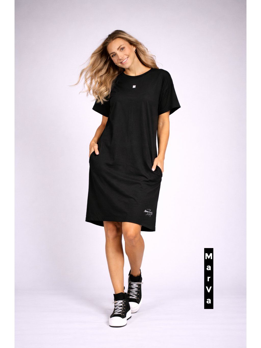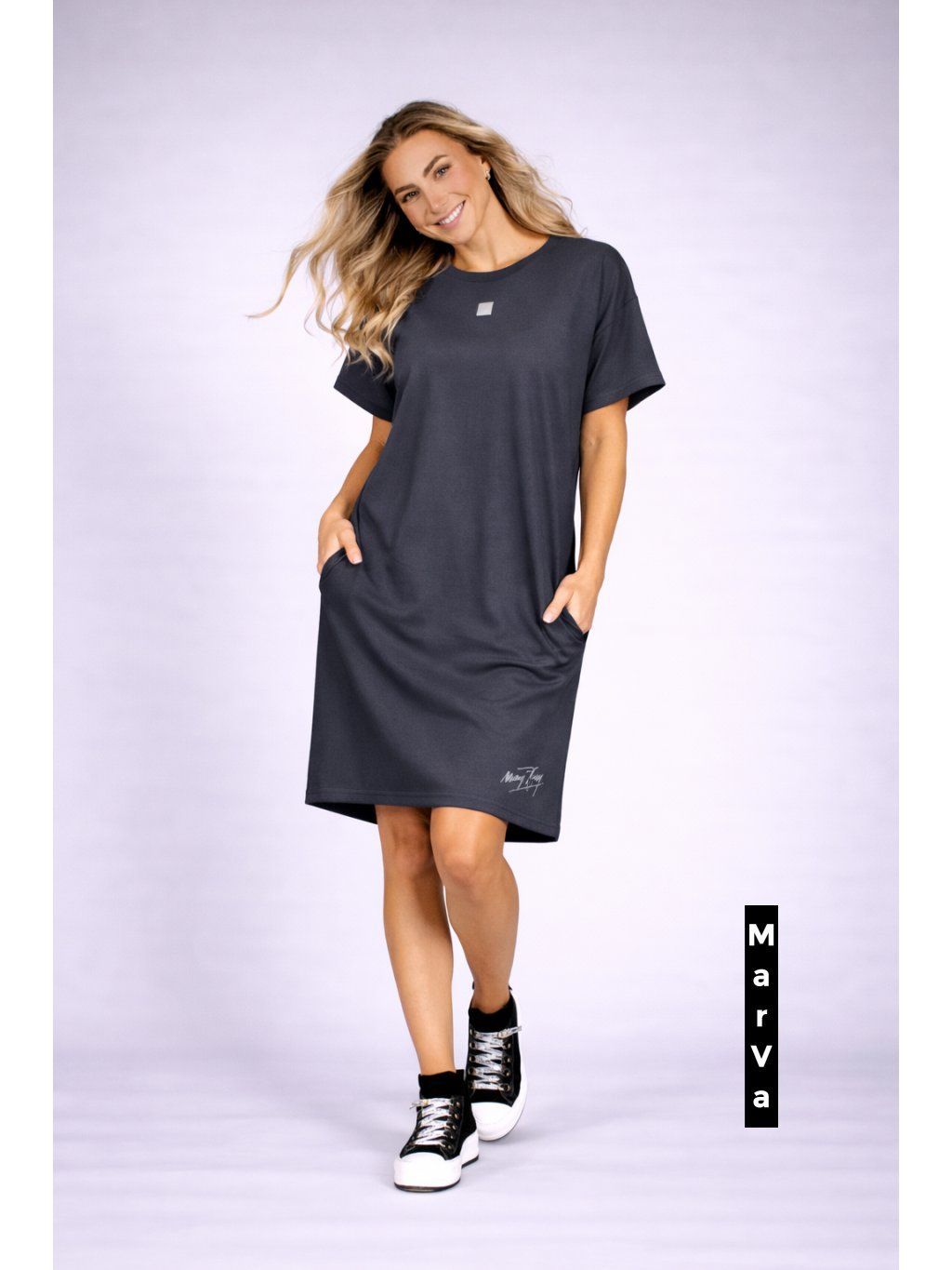 Tyto elegantní a zároveň hravé dámské šaty jsou dokonalým příkladem autorské módy návrhářky Marcely Vymyslické. Vyrobeny z hebkého bio úpletu s příměsí elastanu, přináší pohodlí, šetrnost k přírodě a perfektní přizpůsobivost.