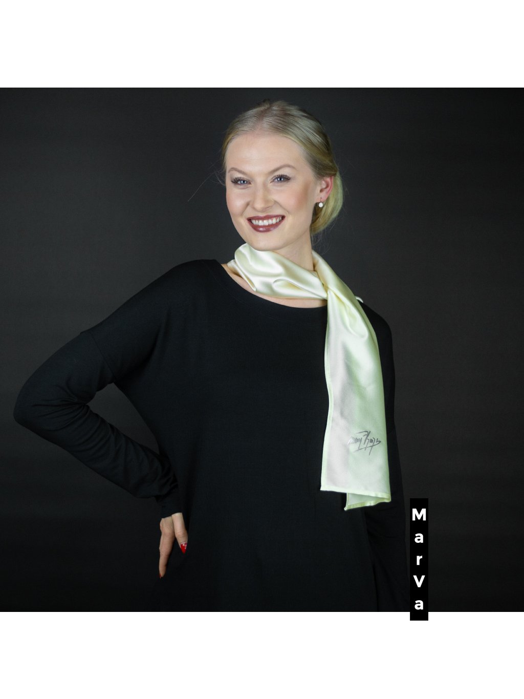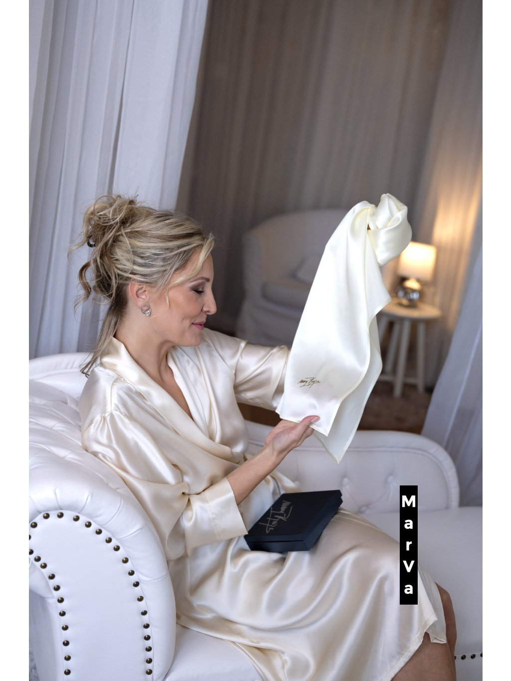 Balení obsahuje: dárková krabička, šál dle Vámi zvolených rozměrů, ze 100% hedvábného saténu, certifikát pravosti, ozdobné peříčko.