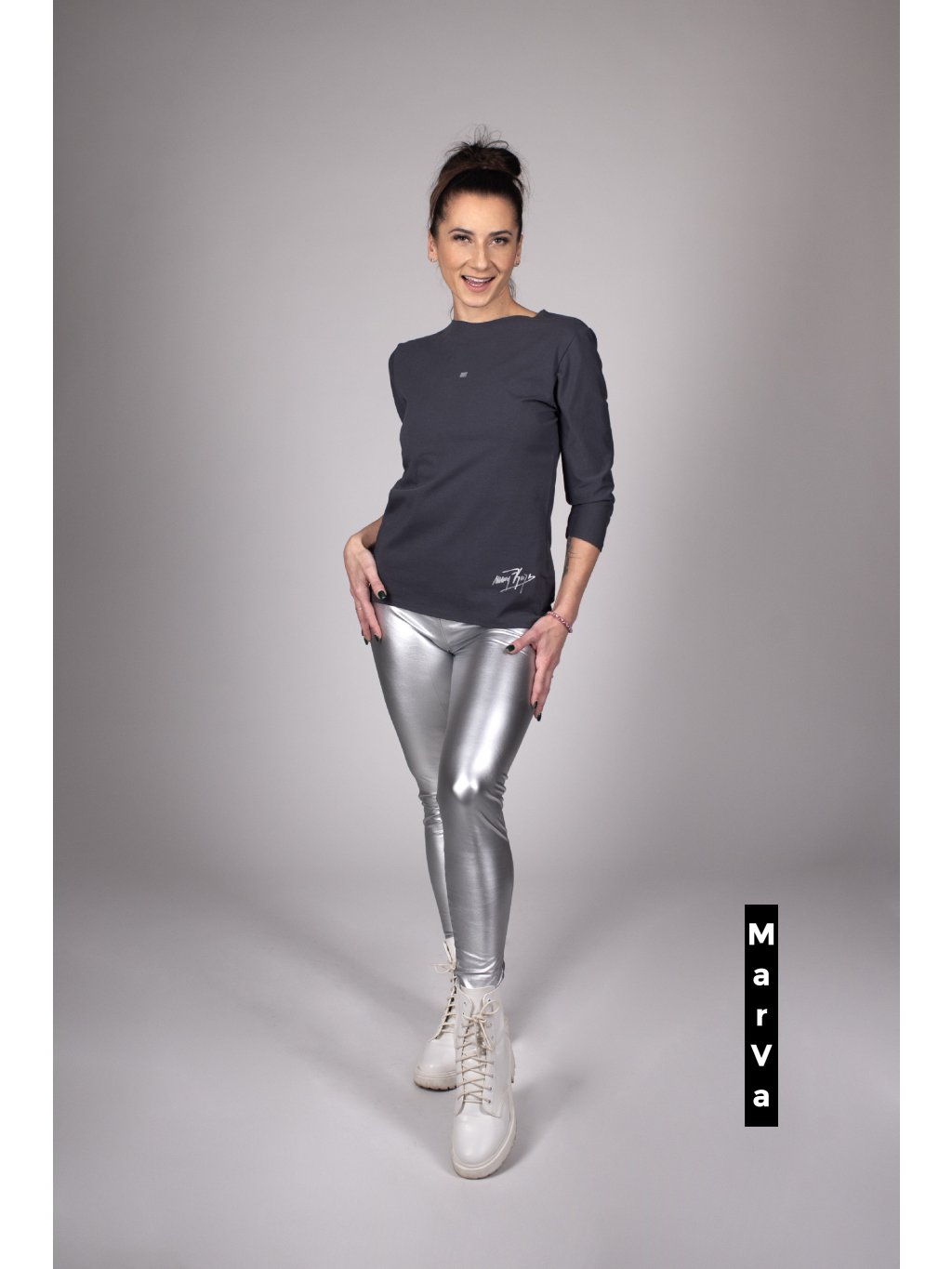 Materiál: Bio úplet (95%bavlna, 5% elastan). Výhoda bio úpletu je, že lehounce chladí, nežmolkuje, a je tak příjemný na kůži, že vám vznikne závislost. :)Aplikace stříbrná.